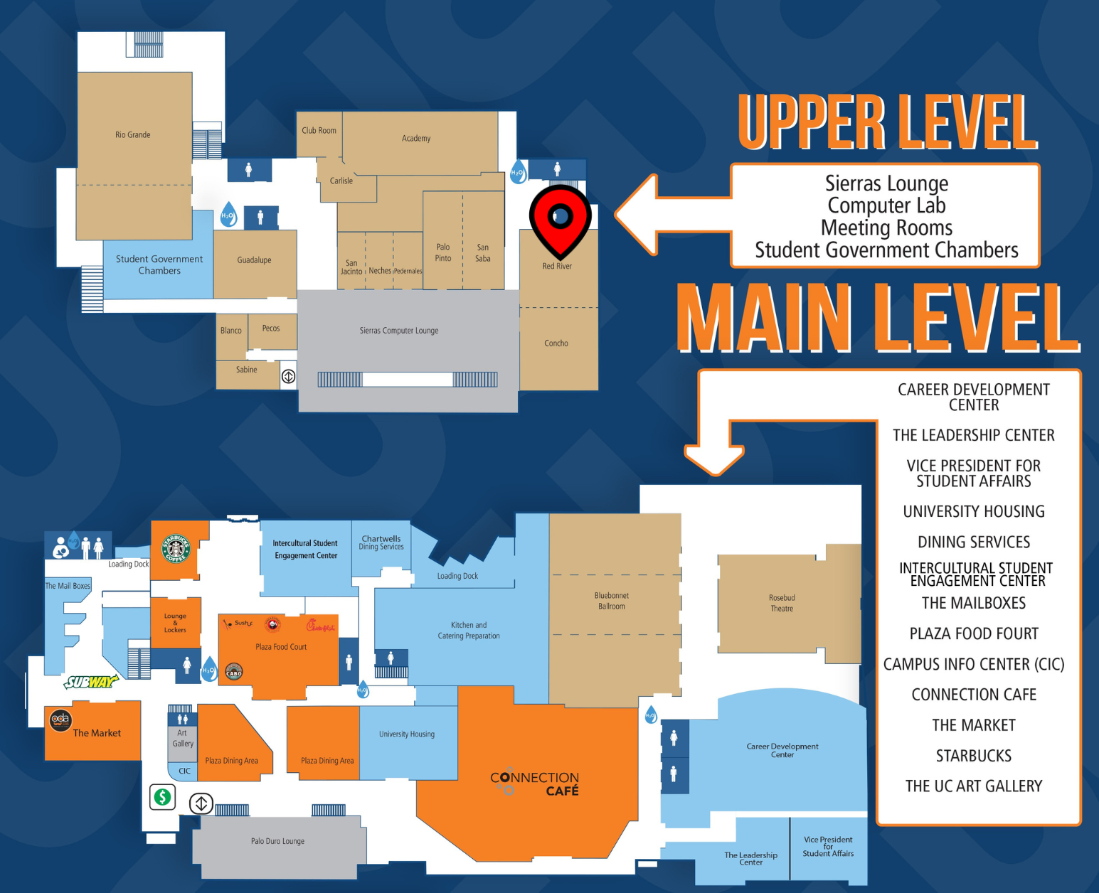 Visitor Parking is available in the lot immediately north of the University Center, or the parking garage a block east. Please see the Google Map to locate the Univeristy Center and the map below for directions to the Red River and Concho Rooms